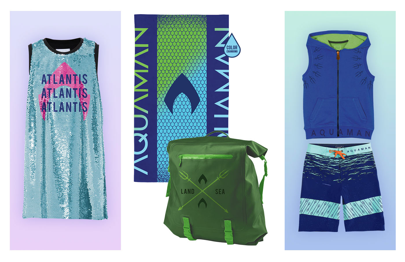 Aquaman is a DC comic superhero who comes from two worlds- land and sea. Embracing that duality, I created an apparel line inspired by the movie for Warner Bros. Consumer Products. Inspired by streetwear and surf culture, the color palette and textures tell the story of Aquaman and his journey back home to bring peace between land and sea.